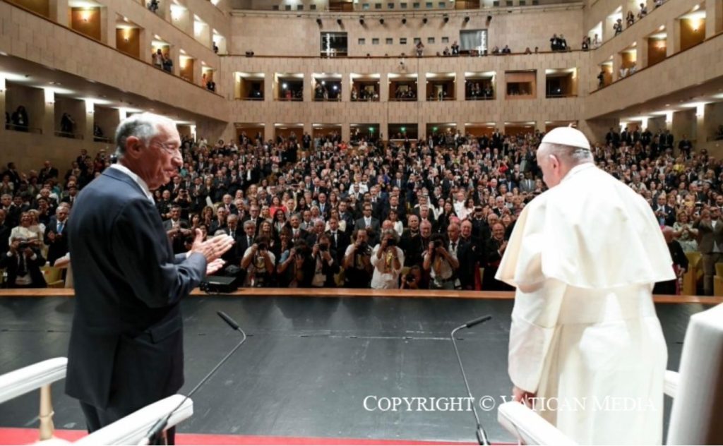 Selon une étymologie discutée, le nom Europe proviendrait d’un mot indiquant la direction de l’occident. Il est certain que Lisbonne est la capitale la plus à l’ouest de l’Europe continentale. Elle rappelle donc la nécessité d’ouvrir des voies de rencontre plus vastes, comme le Portugal le fait déjà, surtout avec les pays d’autres continents unis par la même langue. Je souhaite que les Journées Mondiales de la Jeunesse soient, pour le “vieux continent”, une impulsion d’ouverture universelle. Car de l’Europe, la vraie, le monde a besoin : il a besoin de son rôle de bâtisseur de ponts et d’artisan de paix dans sa partie orientale, en Méditerranée, en Afrique et au Moyen-Orient. L’Europe pourra ainsi apporter sur la scène internationale son originalité spécifique, qui s’est dessinée au siècle dernier lorsque, dans le creuset des conflits mondiaux, elle a fait jaillir l’étincelle de la réconciliation en rêvant de construire l’avenir avec l’ennemi d’hier, engageant des voies de dialogue et d’inclusion, développant une diplomatie de paix qui éteint les conflits et apaise les tensions, capable de saisir les moindres signaux de détente et de lire entre les lignes les plus tordues.